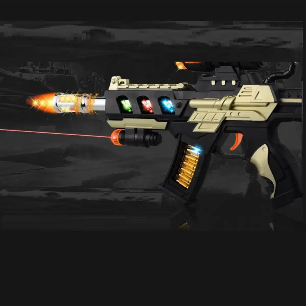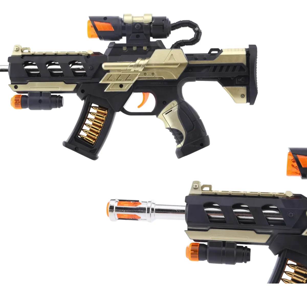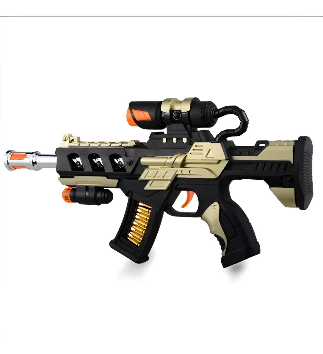 Ametralladora con mira infrarrojo, sonido de simulación, coloridas y deslumbrantes luces y caño giratorio.
