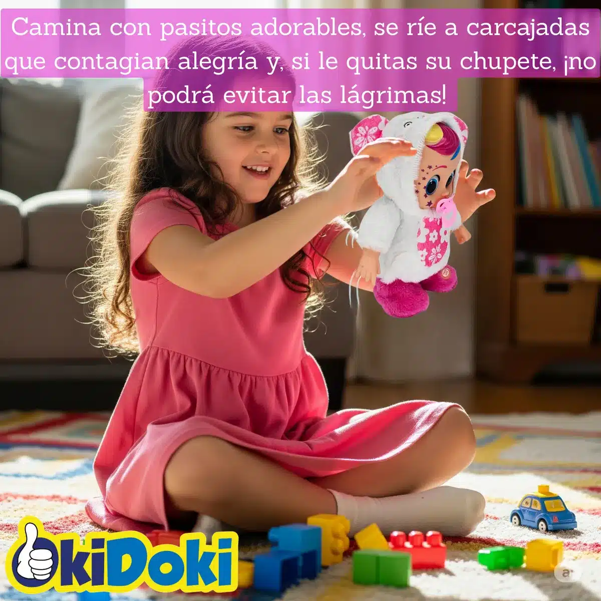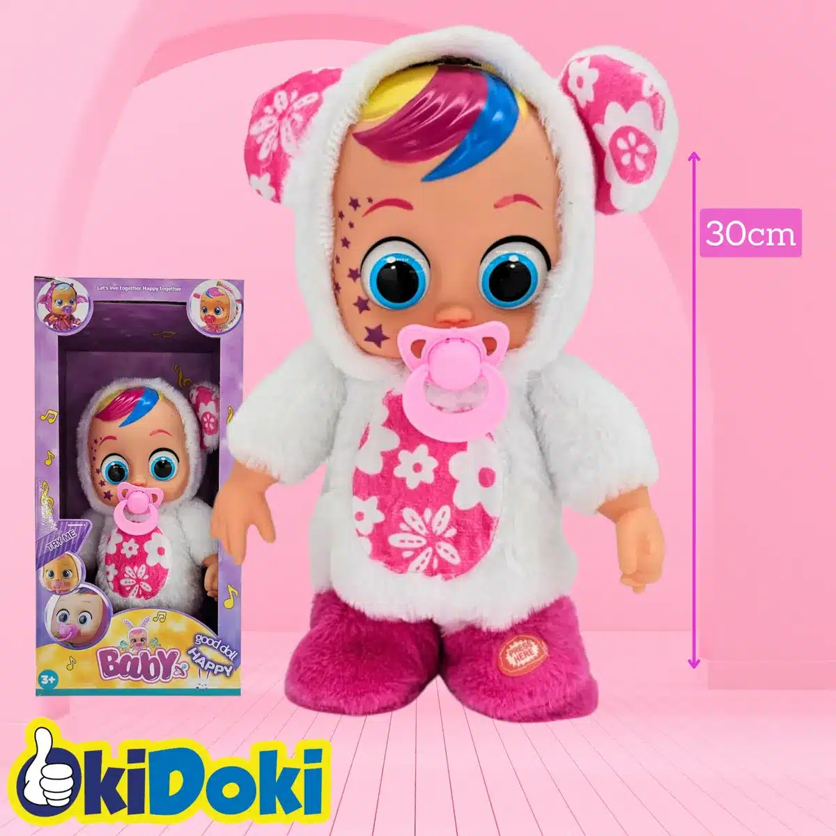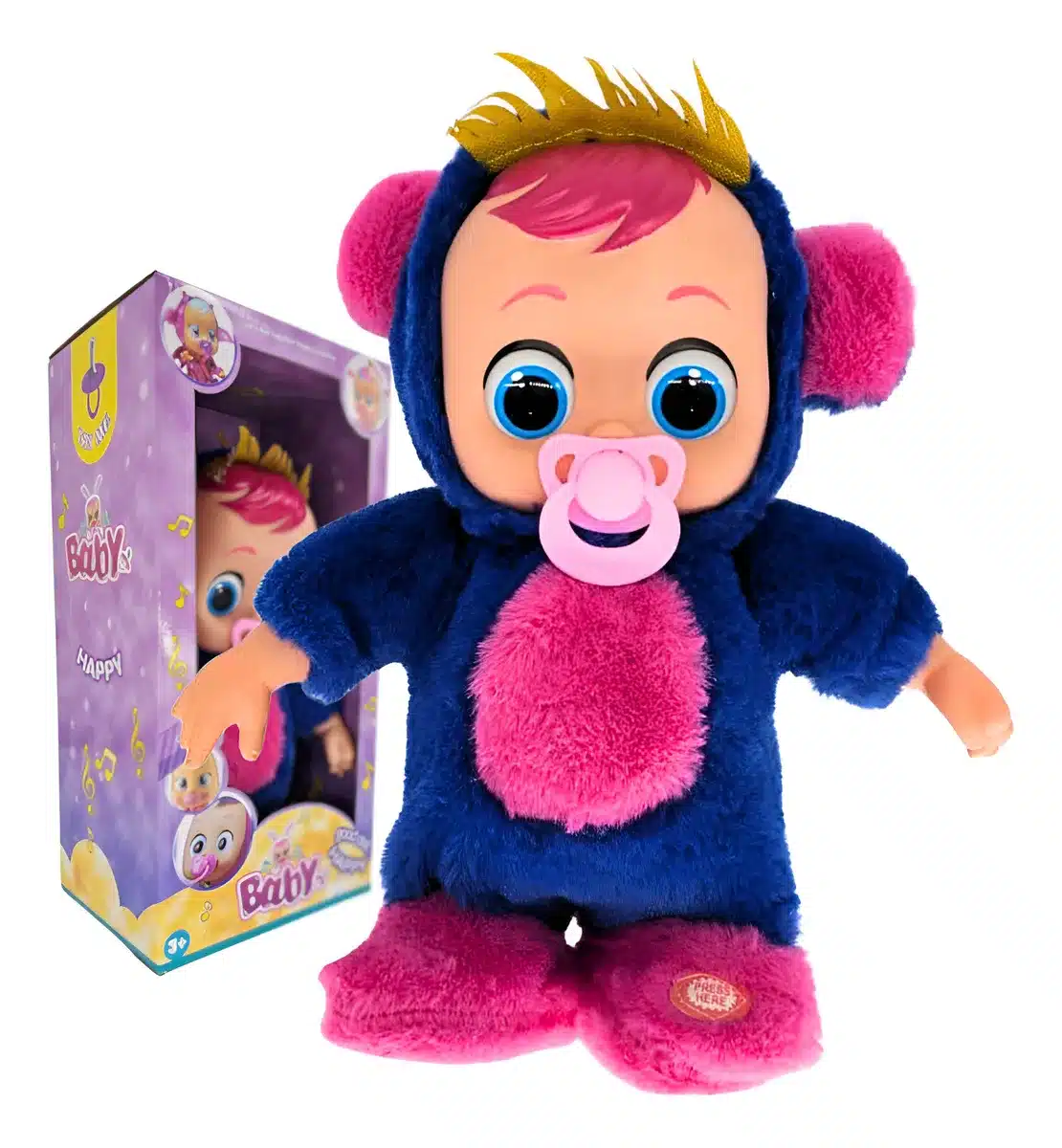 ¡Llora y Ríe! Sus emociones son contagiosas. Escúchalo reír a carcajadas cuando está feliz, y si le quitas su chupete, ¡prepárate para oírlo llorar como un bebé de verdad!
