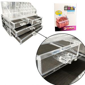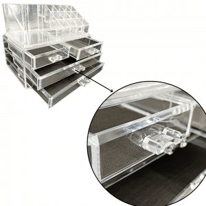Es totalmente de acrilico y su cajones vienen con una mini alfombra negra.
