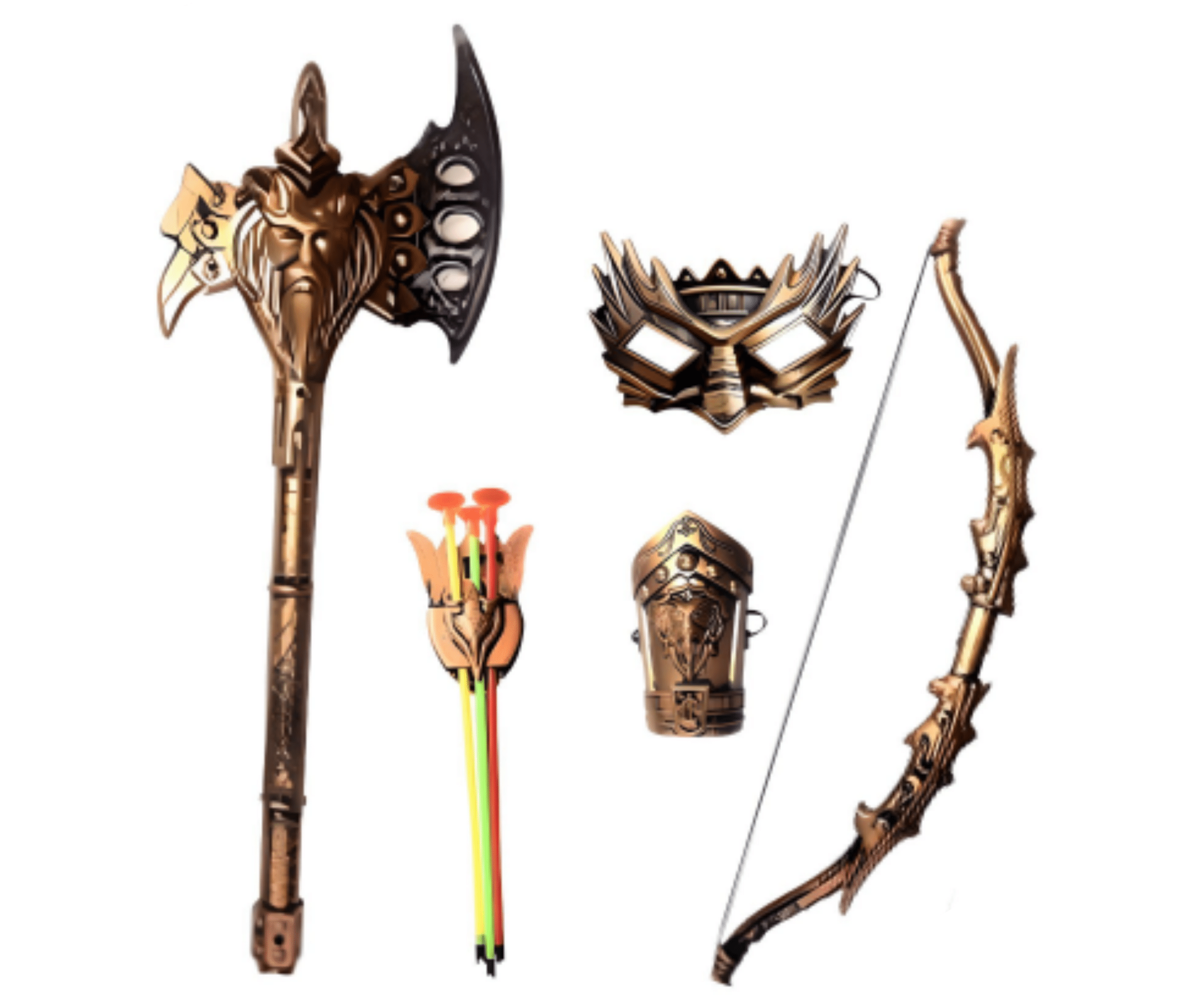 CONTIENE: -1 Antifaz -1 Arco con 3 flechas. -1 Alabarda. -1 Armadura para el brazo/muñeca.